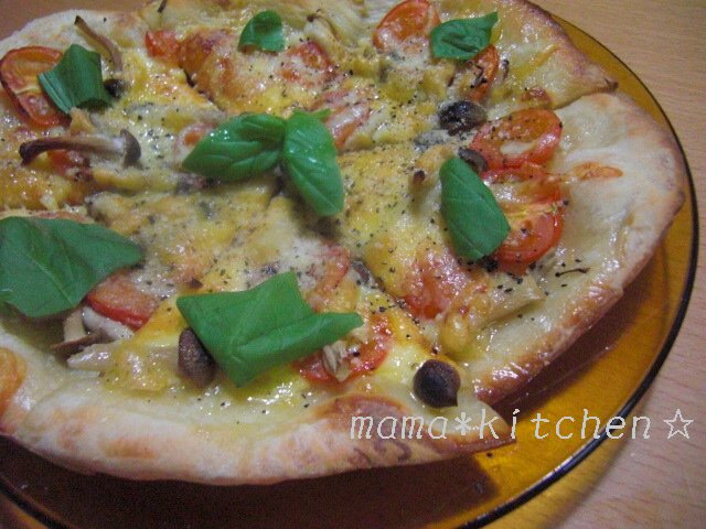 フレッシュトマトときのこのピッツァ♪バジル乗せー。