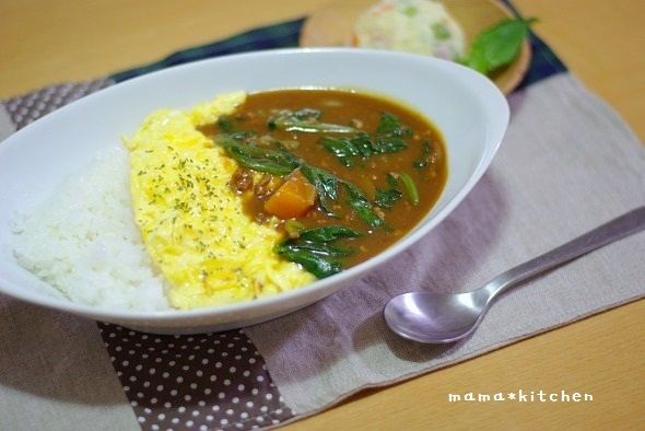 2011-6-15 09:11:55 ふわふわ玉子のせ♪ 挽肉とほうれん草カレー おはようございます^^仕事から帰宅して、大体。。子どもたちが同時に帰ってきます(。-∀-)「お夕飯は、何がいい?」って聞いたときに、カレー!!と言われるとちょっと嬉しかったりして^^ほうれん草は、最後にどっさり加えました!これに、ポテトサラダ!うすいえんどう入