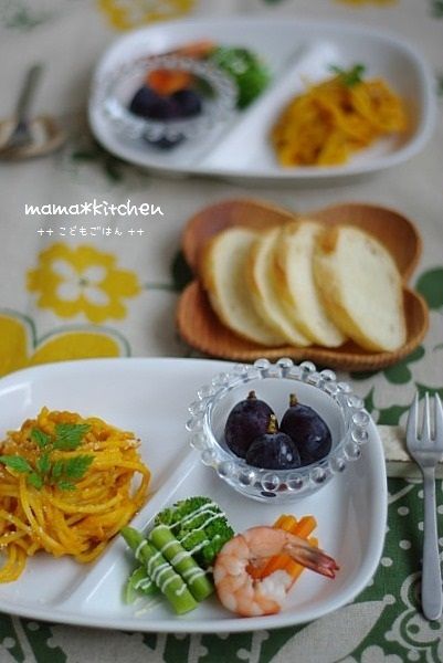 2011-8-28 09:11:15 かぼちゃボロネーゼの、お休みランチ。 おはようございます~!日曜日、ゆっくり過ごされてますか?^^こちら、お休みの日のランチ。かぼちゃが甘ーいボロネーゼです。ボイル海老や、お野菜も、食べてください(´∀`。)デザートは、ブドウです。デザートですよっ大人用、全く同じですが。。パスタです。かぼちゃが
