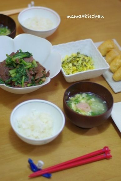 2012-2-10 09:11:16 牛肉と春菊のすき焼き風炒めのお夕飯♪ と、mama*kitchen別館が出来ました~! おはようございます~♪寒い~~っっ!!冬なので仕方ないけど、ほんっと寒いです(。>ωこちら昨日のお夕飯です。牛肉と春菊のすき焼き風炒め!すき焼き用の薄切り牛肉があったので、炒めものにしました^^春菊をたっぷり使いましたが、きのこ類や玉ねぎなんかでも美味しいと