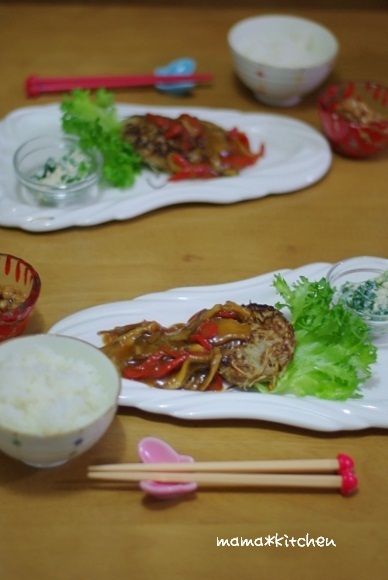 2012-2-18 09:11:46 牛蒡バーグのお夕飯 おはようございます~!ハンバーグのお夕飯です^^今日のハンバーグは、牛蒡バーグ!!「毎日おかず、ときどきおもてなし」に載せているレシピです。周りにカリッカリの牛蒡を纏い、とっても香りの良いハンバーグです♪バター醤油のソースは、レシピ通りですがパプリカとき