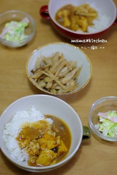 2012-2-22 09:11:57 カレー曜日!カレーには♪ 春キャベツのサラダ おはようございます~(´∀`。)長い事大事にためてました。。コメントのお返事、お返ししております!またお時間あるときに、みてください~^^ カレーの日がやっていりましたっ^^今日は、チキンときのこのカレー。こどもって、ほんとにカレーが好きですよね。私も小さい