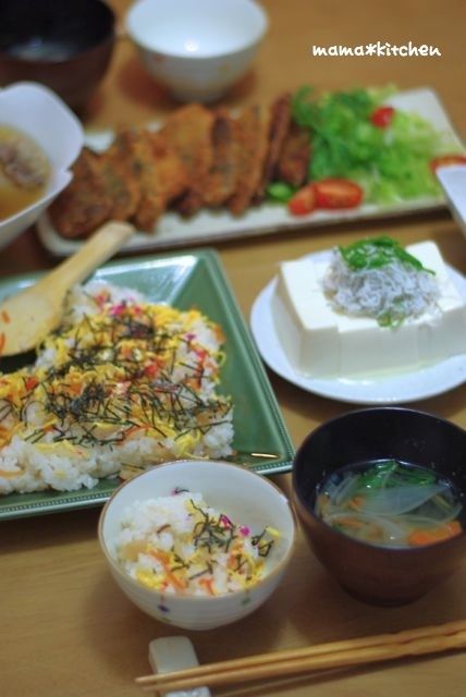 2012-12-17 09:11:47 ちらし寿司と、アジフライのお夕飯 おはようございます~♪母さまからの、お裾分けちらし寿司のお夕飯ヽ(*´∀`)ノお吸い物と一緒に、いただきましたっ!カリッとアジフライ。ポン酢をたらして、いただきます~!しらすを乗っけて、冷や奴。大根のお漬け物、こちらも母さまより。実家の大根を毎年ビール漬けに