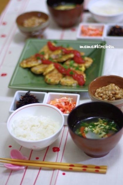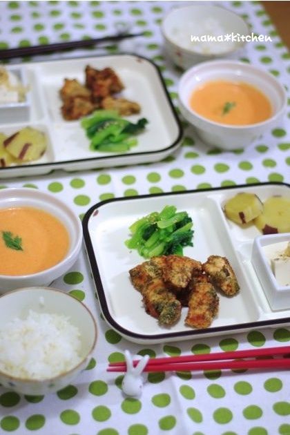 2012-12-12 09:11:10 鶏の磯辺揚げのお夕飯。フォトブックようやく!! おはようございます♪お夕飯です~!メインは、鶏の磯辺揚げです。今日はむね肉で作りました♪海苔の香りが、と~ってもいい感じですねヽ(*´∀`)ノとっても簡単ですが。。レシピはこちらです^^ 鶏肉の磯辺揚げ by Mayu*サツマイモと、小松菜のお浸し、冷や奴。人参ポター