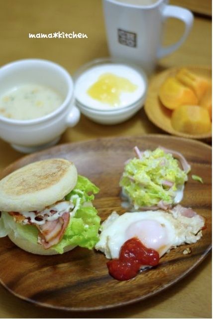 2012-12-18 09:11:51 朝ごはん♪と寒い日はやっぱり。。。 おはようございます!朝ごはんですよ~ヽ(*´∀`)ノイングリッシュマフィンの朝ごはん。ベーコンレタスサンド!めだまやきに、キャベツとハムのヨーグルトサラダ。スープに、りんごヨーグルト、かき。そして、ベーグルサンドの朝ごはん。野菜たっぷりのスクランブルエッグ。