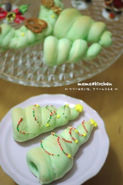 2012-12-24 21:46:40 クリスマスツリーみたいなクリームコルネ☆サンタサンへ♪ クリスマスイヴですね^^サンタ活動前に、更新してみましたっ!笑 連休最後の日、クリスマスっぽいパンを焼きました~!コルネ!ツリーに見立てて、ホワイトチョコで飾りを付けます。が、だんだん飽きてきて。。。雑な仕上がり(。-∀-)4つ焼
