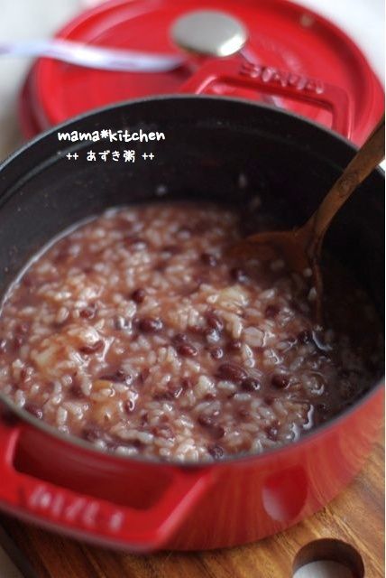 2013-1-15 09:11:49 小豆粥の朝ごはん。 おはようございます~!小正月ということで。。邪気払い、一年の健康祈願に(*´∀`*)朝ごはんに小豆粥を炊きました。小豆を固めに炊いてザルにあげ、そのゆで汁に水を足しておかゆを炊きます~!小豆を足して、塩で味付けし。。。お餅を入れて完成~!とろっと、優しいお豆の