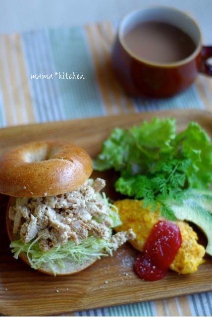 2013-12-20 09:11:32 胡麻チキンとたっぷりキャベツのベーグルサンド。マ・マー 早ゆでレシピ、更新しました! おはようございます^^前日、多めに蒸した鶏肉を使って♪胡麻ダレに絡めたチキンと、たっぷりの千切りキャベツをベーグルに挟みましたっ!ベーグルは、全粒粉入りの自家製♪朝ごはん、しっかりいただきました~ヽ(*´∀`)ノ レシピブログ