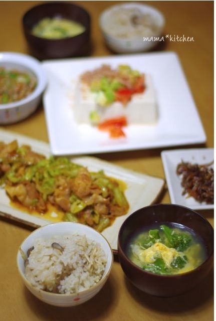 2014-4-4 09:16:36 春キャベツと豚肉の味噌炒め、きのこの炊き込みごはん おはようございます^^そろそろ雨が降り出しそうな。。。怪しい空模様です!もうすぐ出掛けるというのに・・・(゜д゜;)昨日のお夕飯は、春キャベツで!豚肉と味噌炒めにしました。納豆に、冷奴。冷奴は、アボカドとフルーツトマトを刻んで乗せたら、子どもから苦情が。