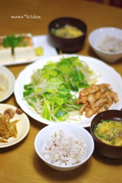 2014-4-22 09:11:22 豚トロ塩焼きと、蒸し野菜。 おはようございます^^豚トロの塩焼きでお夕飯。たっぷりの春キャベツ&もやしを蒸し焼きに。こちらはポン酢でいただきました!姫皮のおかか煮。奥は、水餃子~^^舞茸の玉子スープに、雑穀米です。ごちそうさまでした~♡ こっちゃんがく