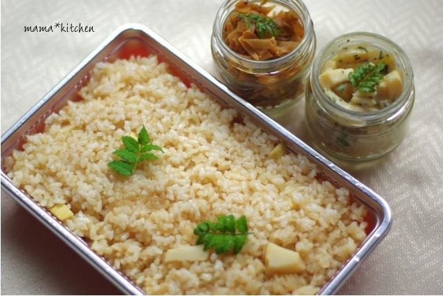 2014-4-23 09:11:49 母から♡筍のおいしいとこ。 おはようございます^^母より。筍の「おいしいとこ」いただきました!!(すっかり下処理され、調理され、あとは食べるだけのもの)筍ごはんに♡木の芽和え&姫皮のおかか煮。そして手前のは。。花山椒。おいしい~♡良い香り^^春を楽しませてもらいました!