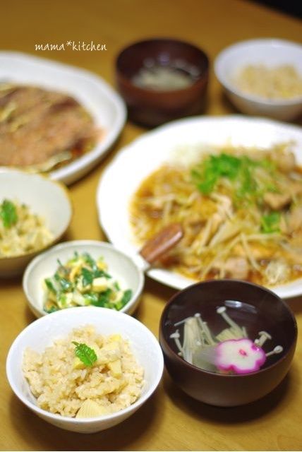 2014-4-15 09:11:30 筍ごはん、ふわふわとろろ焼き。 おはようございます^^あたたかくなりましたね~♡今シーズンはじめての、筍ごはんは。。母からのお裾分けごはんヽ(*´∀`)ノ筍の木の芽和え、わけぎと揚げのぬた。キャベツとネギたたっぷり入った、とろろ焼き。粉は極少量。とろろと卵の生地で、ふっわふわに焼き上がり~