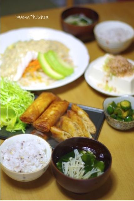 2014-4-16 09:11:38 春巻きとネギマヨソースのバンバンジーサラダ おはようございます~^^久しぶりに春巻きっ!昼間に春巻きの話題になって、やっぱり食べたくなりました(。-∀-) 揚げ物のときは、やっぱり千切りのキャベツだな~♡そして、ピリ辛きゅうり漬けに冷奴。胸肉のハムでバンバンジーサラダ。サッと茹でたもやしに人参、あとはア