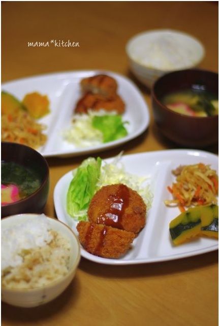 2014-4-10 09:11:09 メンチカツと南瓜の煮物。不注意に注意。 おはようございます~!久しぶりに、メンチカツのお夕飯です。南瓜の煮物は、圧力鍋であっというまに完成~切り干し大根の煮物と、わかめと花麩のすまし汁。Keyはきのこごはんも食べたいというので、白米とハーフ&ハーフで。笑ごちそうさまです~^^