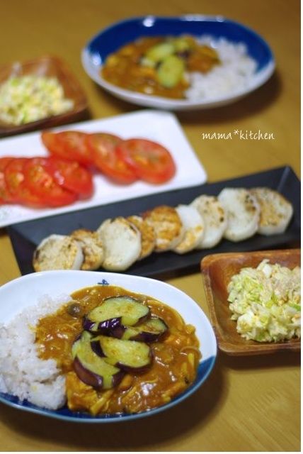 2014-6-25 09:11:12 揚げ茄子のカレー おはようございます^^まだ一週間が始まったばかりなのに、いきなりカレーライス登場~(;´∀`)・・・大好きな揚げ茄子を乗せたカレー♡ツナ入りのコールスロー。長芋の塩焼き、冷やしトマト。やっぱカレーだねぇ~♪長芋もおいしかったです^^
