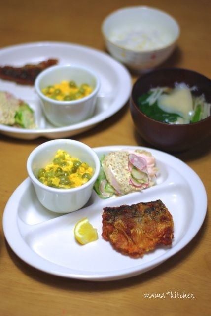 2014-6-11 09:11:31 サバ竜田と、ウスイエンドウの玉子とじ。 おはようございます^^暑っついですね~!じめじめじめじめ。。京都の夏を感じるようになった今日この頃( ゚∀゚)元気を出して、サバ竜田のお夕飯です。レモンで、気持ちさわやかに~♡夜のうちに仕込んでおいた鶏ハムと、実家のキュウリ&ラディッシュで胡麻ダレサラダに。