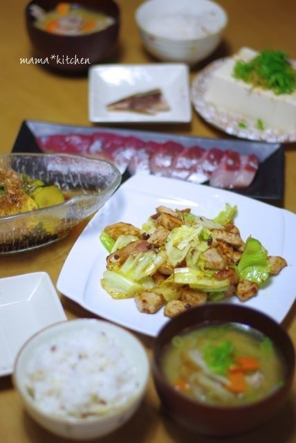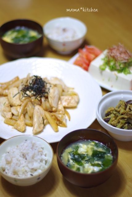 2014-6-26 09:11:07 鶏むね肉と長芋のたらこ炒め、茄子の胡麻和え。 おはようございます^^暑いです~昨日のお夕飯です。鶏むね肉があったので、長いもと玉ねぎと炒め、たらこを加えて仕上げました♪これ、美味しかったです♡茄子の胡麻和え。たたきオクラ乗せ奴。冷やしトマト添え♡わかめと玉子のスープ。近頃お気に入りの雑穀米。\夏の元