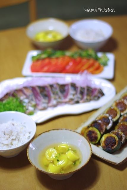 2014-6-19 09:11:08 ズッキーニの肉詰めと、夏野菜たっぷりのお夕飯。 おはようございます^^実家のお野菜が、豊富にとれるというこの時期♡太陽の恵みを感じながら、幸せを噛み締めています♪まずは、ズッキーニの肉詰め。BBQソースで!この肉詰め部分を抜いたズッキーニを、出汁煮の餡かけにしました。鰹のタタキに。。冷やしトマトと、キュウ