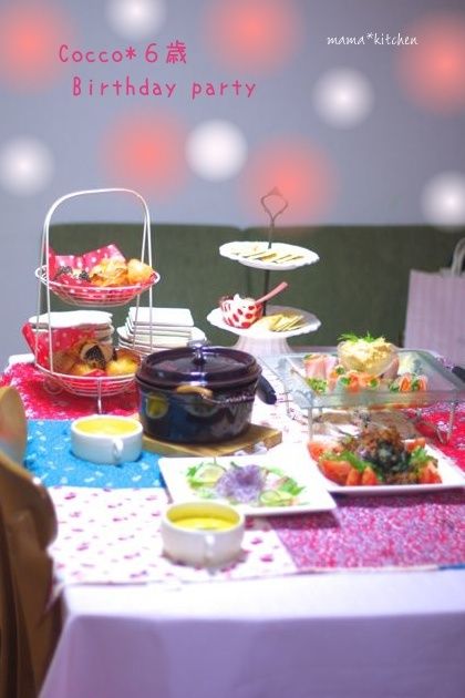 2014-9-15 08:00:00 6歳女子。子どもが好きなお料理いっぱい♡ケーキいっぱい♡ 誕生日パーティー お久しぶりの更新です^^連休ですね~♡楽しんでますか~!?先日、我が家の娘Cooco*が6歳のお誕生日を迎えました。このmama*kitchanは、Cocco*が生まれる1ヶ月前からスタートしたので、ブログも7年目に突入したということです。パーティー大好きなうちの子ども達。この飾
