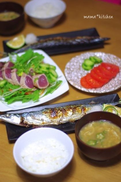 2014-9-29 07:23:28 秋刀魚と鰹のたたき。週末スーパー銭湯。 おはようございます!月末の週明け~。。。秋刀魚がおいしい季節です^^筒切りにして、生姜いっぱい入れて、圧力鍋で骨まで食べられるようにしよう!って思いながら、まだ塩焼きばかり楽しんでます。飽きたらします。笑鰹のたたきと、トマト。もう終盤、夏の名残~たたきに