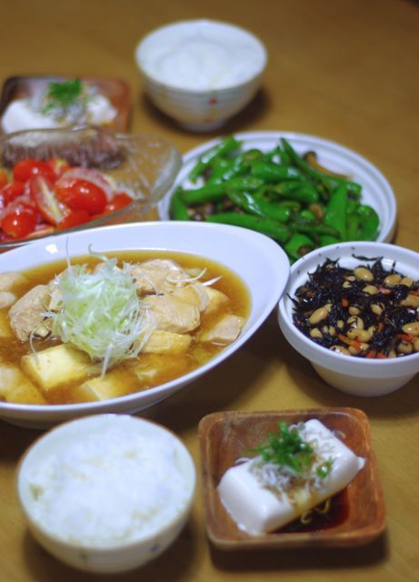 2014-9-10 07:07:03 鶏むねと厚揚げのとろみ煮でお夕飯。と、伊勢旅行 おはようございます^^鶏むね肉と厚揚げ♡大好きな組み合わせで、とろみ煮を作りました。これからの時期、とろみが嬉しいです。白髪葱をたっぷり添えて。ししとうとしめじの炒め物と、ひじきと大豆の煮物。プチトマトは、アイコちゃん。おじゃこ乗せ、冷奴。ごちそうさまで