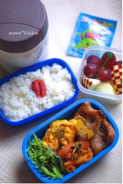 2014-9-25 07:30:00 Keyの運動会弁当。イベントお疲れさん会とお土産。 おはようございます!小学校2年生の息子氏。先日、楽しみにしていた運動会がありました^^息子の小学校は、ランチタイムに教室でお弁当を食べるということで。息子の分だけの運動会弁当(●´∀`)助かる~ぅ生姜焼きにペンネナポリタン、豆苗のお浸し、スクランブルエッ