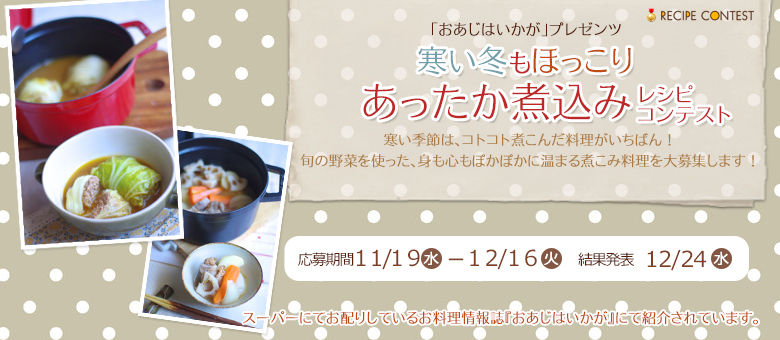 2014-11-21 07:00:00 「おあじはいかが12月号」煮込み料理を紹介しています。 おはようございます^^スーパーなどでご覧いただける、お料理情報雑誌「おあじはいかが」12月号の煮込み料理を考案させてもらっています。簡単に出来る2品です。カレースープのロール白菜。豚肉と冬野菜の塩ポトフ。そして、Nadiaさんにて煮込み料理コンテストもスタートし