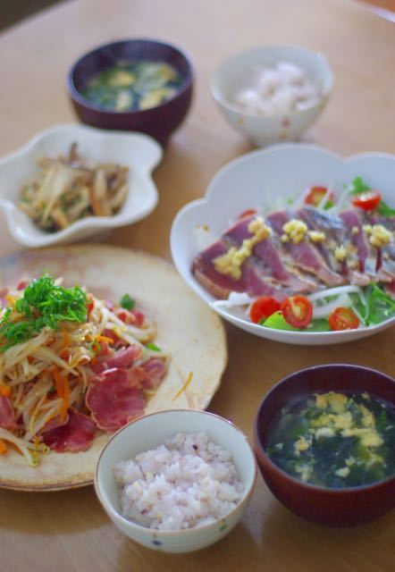 2015-6-15 07:00:00 鰹のたたきサラダと、牛タンともやしの炒め物。「フライパン1つで作るおかず」発売! おはようございます^^休みは一瞬で終わりますね(;´Д`)さ、今週も頑張っていこう~!まずは、牛タンと野菜たっぷり。ネギ塩レモンで、さっぱりとした炒め物です。奥は、エリンギの焼き浸し。鰹のたたきサラダ。溶き玉スープに、ごはんでした。「レシピブログで人気のフ