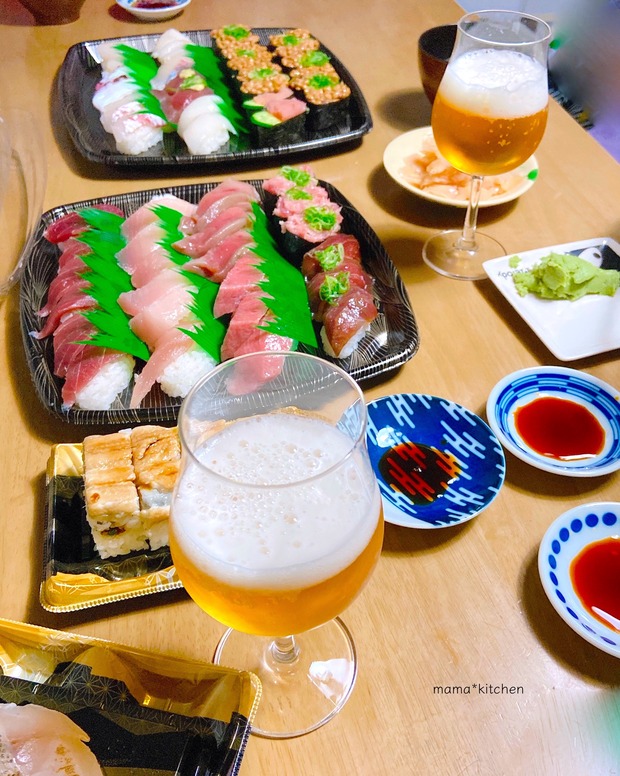 2020-7-15 08:00:50 お寿司の週末ごはん おはようございます^^先週の週末ごはん。ちょっと私が仕事で忙しかったので、お寿司に助けてもらいました〜♩子供達の食べる量が増えてきて、結構たくさん買ってきてもペロリとなくなる。笑随分と、家族で外食していないので・・こういうのは嬉しい〜〜〜帰ってすぐビール