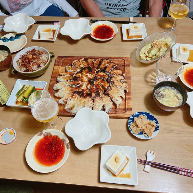2021-5-18 08:00:52 しそ餃子の週末ごはん♩ おはようございます^^火曜日。今日もお天気悪い〜さて、先週末の家族が揃った時のごはん。いつもの餃子を作りました!!みんなちょこんと座って待機中。5秒くらいで写真撮り・・・お待たせしました〜〜!良い感じ〜^^ 餃子が綺麗に焼けると、気分が良いわ〜冷たく冷やし
