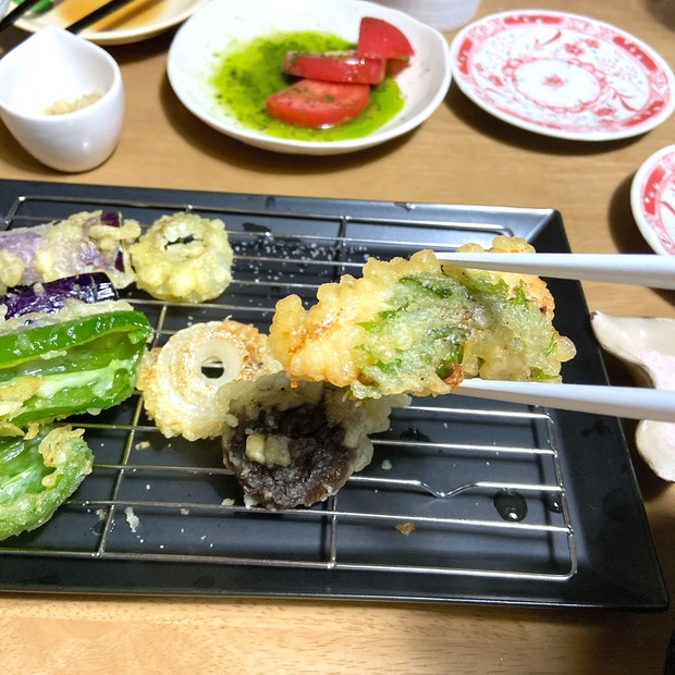 2021-5-25 08:00:35 半田そうめんと天ぷらの週末ごはん おはようございます^^この前の、週末ごはん。揚げたての天ぷらと、半田そうめん♡新玉ねぎ、しいたけ・・塩でどうぞ〜!ピーマン、ナス、ささみの大葉巻き。 熱々、美味しい。実家から届いた、そら豆はグリルで丸焼きに。あとは、カリカリに焼いたお揚げさんと、しらすの