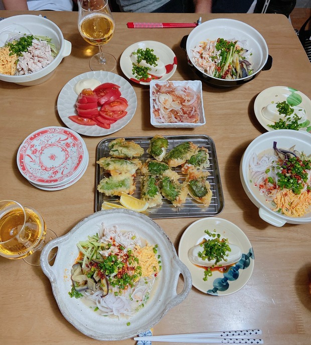 2021-6-8 08:00:21 豆乳サラダ蕎麦と、タラの大葉天ぷらの週末ごはん おはようございます〜^^先週末の夜ごはんです。豆乳サラダ蕎麦にしました!揚げナス、錦糸玉子、ささみ、きゅうり、赤玉ねぎをトッピング。大葉を巻いたタラを天ぷらに!ピンク色のアンデス塩とレモンでいただきました〜!タラ、フッワフワで最高〜!天ぷらで食べるの、一