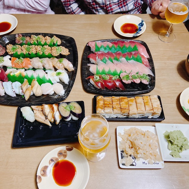 2021-11-3 20:00:00 スシローのお寿司で、夜ごはん。 こんな時間に、こんばんは。週の真ん中、祝日ありがとう。水曜日が休みだと、作り置きも作り足せるし、家族ともちょっとほっとしながら関われるので良いわ。毎週水曜日は休みにしてほしいな〜10月、ずっと私も忙しかったんだけどパパもめちゃくちゃ忙しくて。なんか久々にゆ