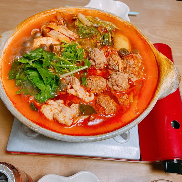 2021-11-9 08:00:39 ポン酢は神!!を再確認した週末ごはん、鍋メドレー。 おはようございます^^先週の、最初の鍋。真っ赤!!めちゃくちゃ激辛鍋に見えますが、市販の鍋スープを使ったトマト鍋です。鍋好き家族ですが、たまには変わり種を・・・と思って。トマト鍋スープを購入。このままでは、濃いのが苦手なうちのファミリーにドヤされると思い