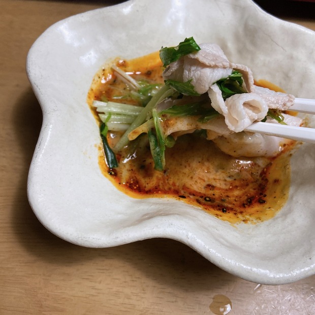 2023-1-31 08:00:01 ゴマだれで食べるピリ辛豚しゃぶ おはようございます〜寒い日はお鍋に限る。お鍋しか思い浮かばない・・こちら、いつもはポン酢でいただく豚しゃぶですが。。。なんか急にゴマだれのようなタレで、尚且つピリ辛で食べたい!!食べたい食べたい!!と口がなりまして。市販のゴマだれに、食べる麻辣湯を入れ、