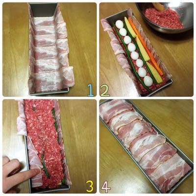 ③パウンド型にベーコンを敷く。②の1/3を敷き詰める。茹でた野菜とうずら卵を並べる。また②の半量を上に被せ、野菜を並べる。残りの②を敷き詰めて、ベーコンで蓋をする。上からしっかり抑える。(少しベーコンが足りなくても大丈夫です。)