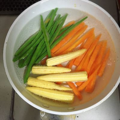 ①人参を縦半分に切り、更にもう半分の大きさにする。1cm幅で切り、更に同じ幅で細長く切る。三度豆のヘタを切る。鍋に湯を沸かし、人参を入れる。沸騰したら三度豆とヤングコーンを加えて2分茹でる。