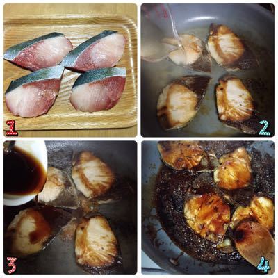 ②フライパンに油をひき、ブリを焼く。しっかり焼き色がついてから返して両面焼き酒を加えて強火でアルコールを飛ばす。