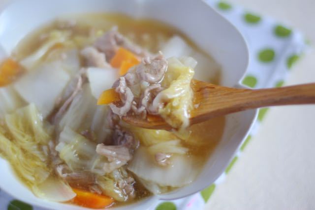 ②フライパンにごま油をあたため、豚肉を加えて塩を振り焼く。人参と白菜を加え、白菜がしんなりするまで炒める。Aを加え、蓋をして強火のまま5分蒸し煮する。
