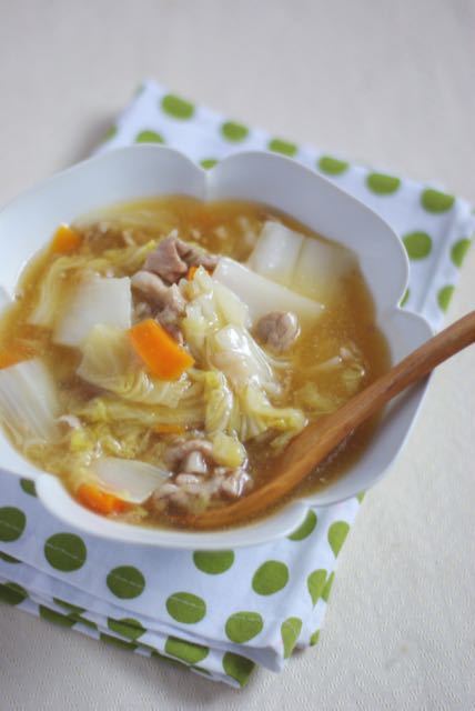 ①白菜は芯部分を繊維に沿って半分に切り、向きを変えて3cm幅でそぎ切りする。人参は、長さを4~5cmに切り、短冊にする。豚肉は一口大にあうる。