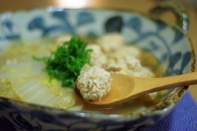 ③鍋に水を入れて沸かし、①をスプーンで落として鶏団子を茹でる。鶏団子の表面に火が通ったら、白菜を加えて煮る。