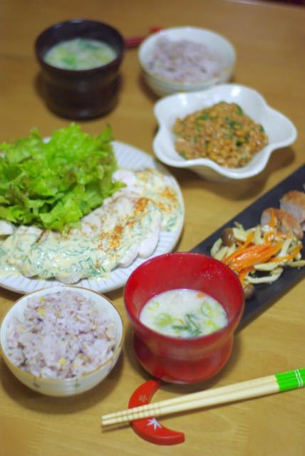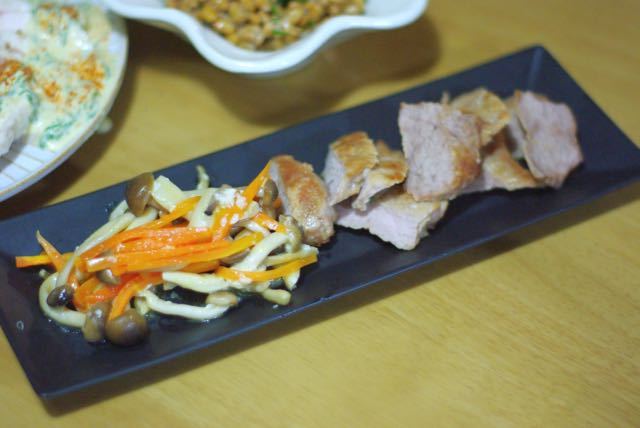 豚肉の山椒焼き、人参としめじの塩麹炒め、納豆(←まぁこれは毎日)