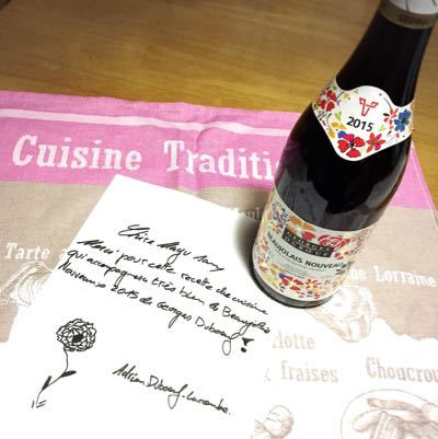 ボジョレー解禁と共に、今回レシピ制作でお世話になったボジョレーヌーボー生産者のアドリアンさんから、直筆メッセージ付きのジョルジュ デュブッフ ボジョレーが届いてました!!