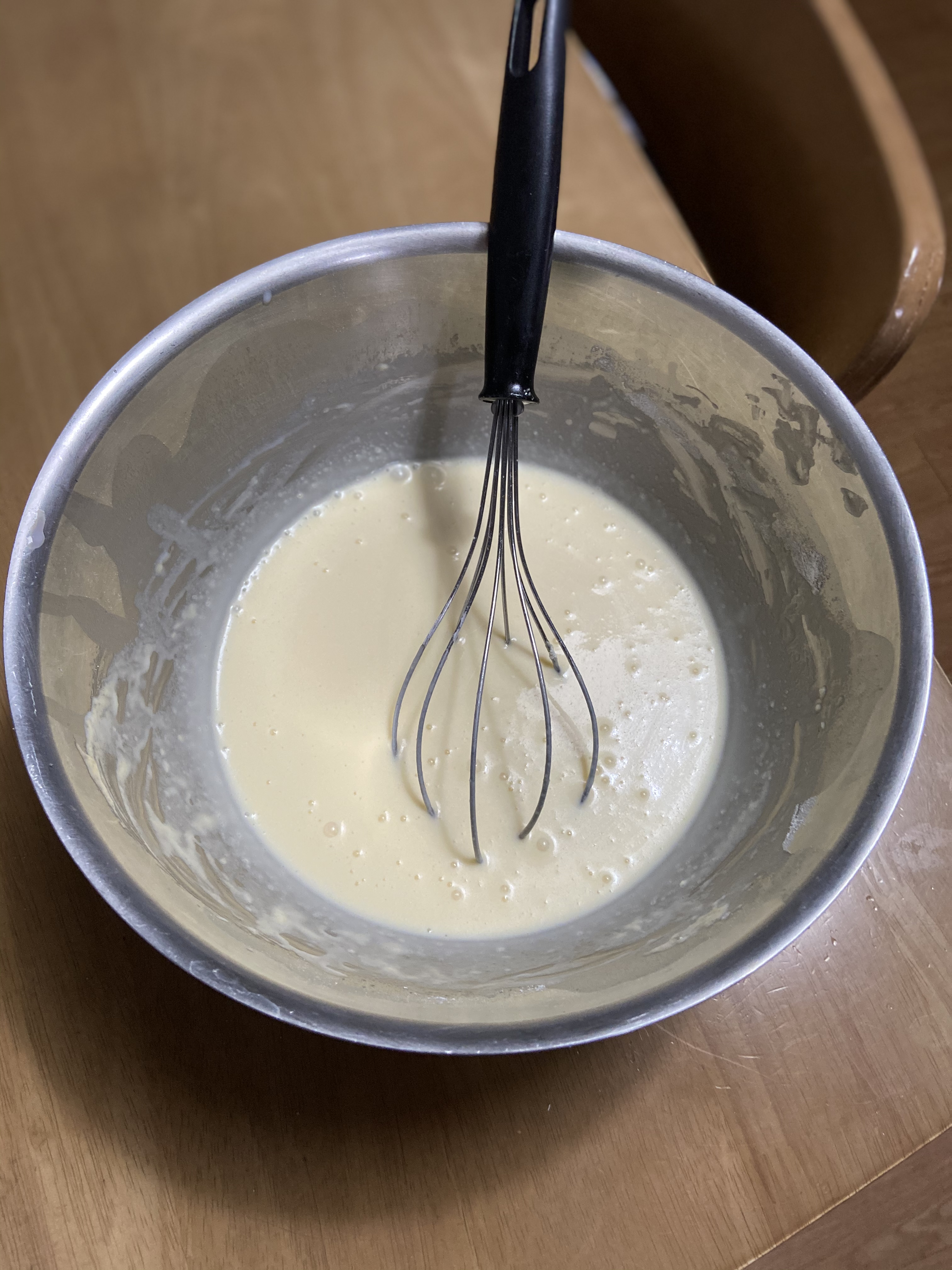 ①卵をボウルで溶き、牛乳を半分ほど入れて泡立て器で混ぜる。
