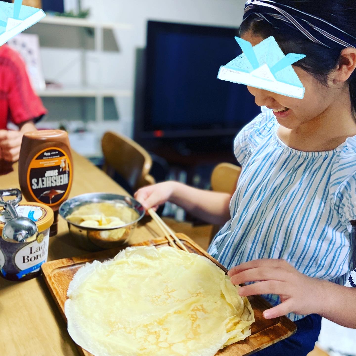 娘、この間に宿題を思いっきりやる。やらないと、クレープ焼けないし、頑張る!笑