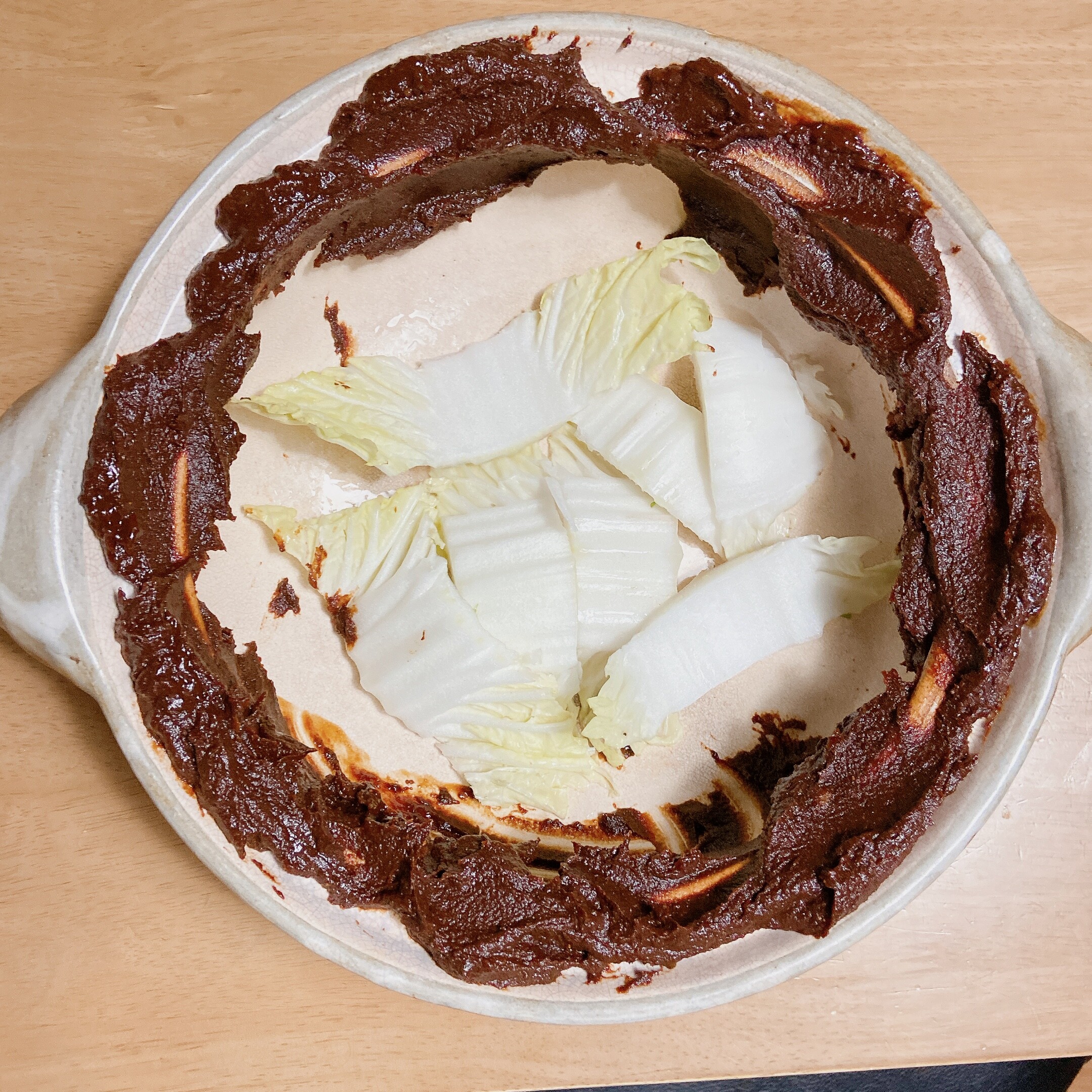 ①Aを混ぜ合わせる。土鍋の淵に塗る。底に白菜の芯を敷く。