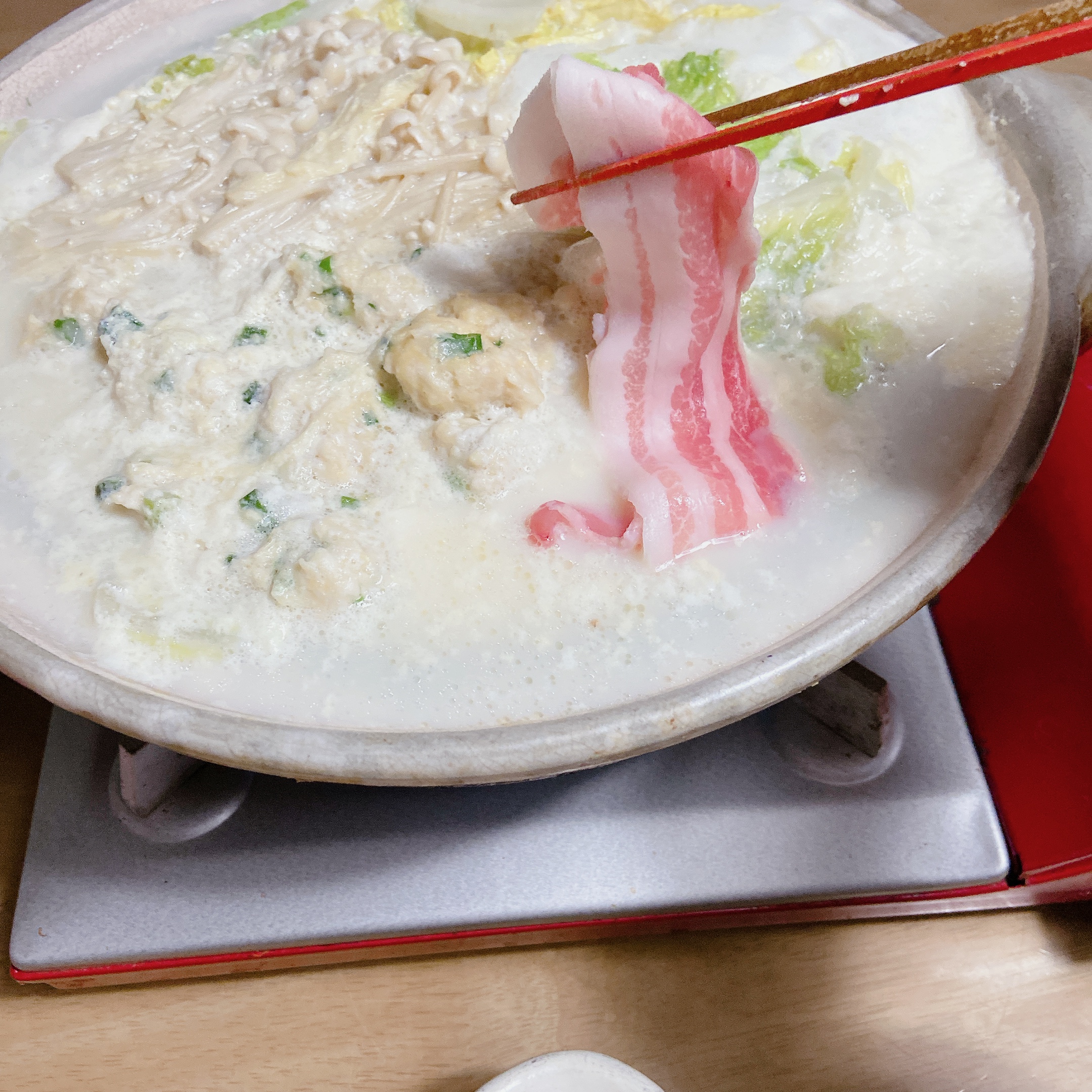 土鍋に半分ほど水を入れて沸騰させ、鶏団子を作り・・取り出したらここに白だしを少し濃いめに入れます。豆腐、白菜、えのきだけ、しらたきを加えて無調整豆乳を加え、煮たたないように静かに加熱。
