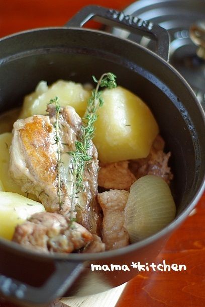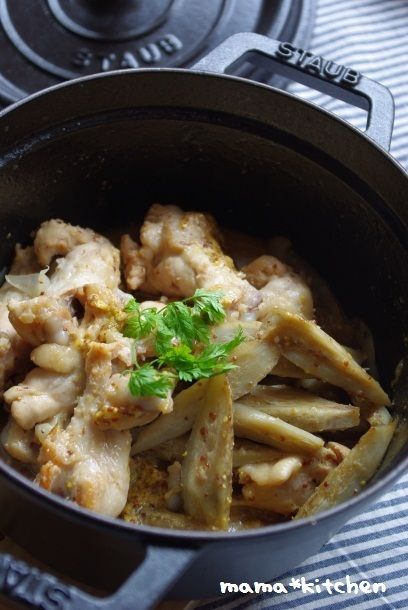 2010-11-16 09:11:06 骨付きチキンと牛蒡のハニーマスタード煮。。。実家の自家製野菜 おはようございます^^今日はstaubレシピです。ピコ・ココット ラウンドの20cmを使用して作ります!手羽元と、牛蒡を使って。甘くて、我が家の子どもたちも大好きなハニーマスタード煮です^^白ワイン・水・ローリエ・蜂蜜で、塩を軽く振った手羽元と牛蒡と玉ねぎをコトコ