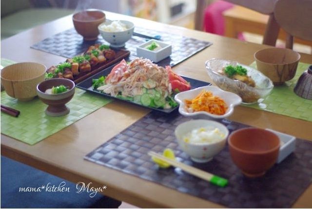 2015-7-15 07:42:29 蒸し鶏と春雨のサラダ仕立てで週末ごはん。夏のデザートといえば!! 昨日に引き続き、暑いですね~!昨日は朝は5時半に起きましたが、すでに暑くて。。すぐにエアコンをピッ(;・∀・)まだ梅雨明けしてないって・・どゆこと~週末ごはん。みんな大好きとうもろこしごはんで。お汁は、なめこ汁。蒸し鶏と春雨のサラダ仕立て。レタスをちぎり、茹